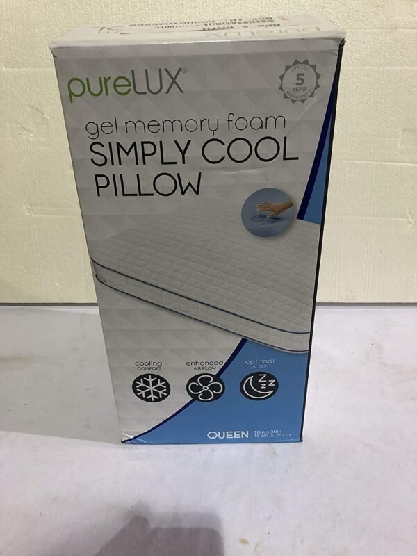 Pure Lux Simply Cool Pillow Gel Memory Foam Optimal Sleep Cooling Comfort Queen. Condition is New with tags. A perfect combination of pressure relieving support and cooling comfort, the pureLUX Simply Cool Gel Memory Foam Pillow is designed to provide everyone more restful sleep. Whether you sleep on your side, back or stomach, you’ll get the best in support and comfort. Tailored sides give your pillow extra lift to cradle your head and neck for increased spinal support. Gel memory foam transfers heat away from the body to create the ideal sleep temperature. Active cooling technology in the cover provides continual cooling and creates a surface that feels amazingly cool while you rest. The soft, zippered cover adds a luxurious feel and is machine washable. Features: Enhanced air flow for additional cooling comfort Memory foam retains its shape and never goes flat Gusseted profile adds additional height for spinal support Promotes proper head and shoulder alignment Conveniently arrives tightly packed in a portable box Machine washable zippered cover Dimensions: Queen: 18in x 30in